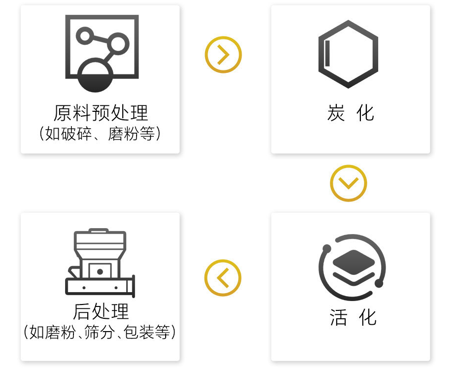 (一)、活性炭生产常见流程:原料预处理(如破碎、磨粉等)→炭化→活化→后处理(如磨粉、筛分、包装等)