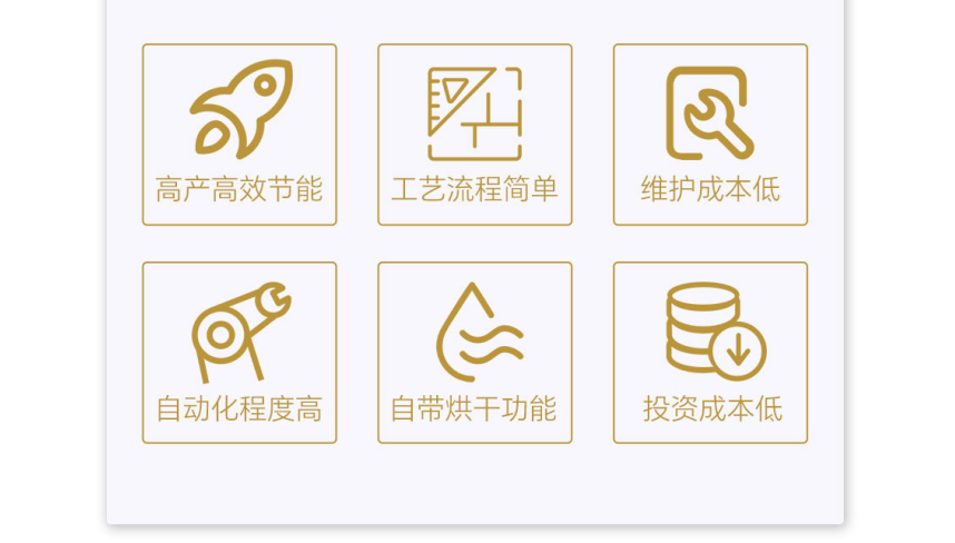 优势特点:、高产高效节能、工艺流程简单、维护成本低、自动化程度高、自带烘干功能、综合投资成本低