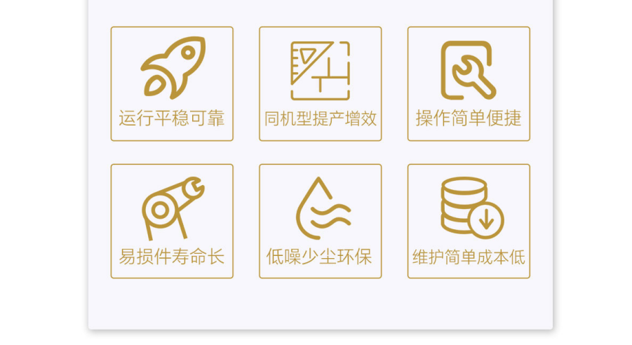 优势特点:运行平稳可靠、同机型提产增效、操作简单便捷、易损件寿命长、低噪少尘环保、维护简单成本低